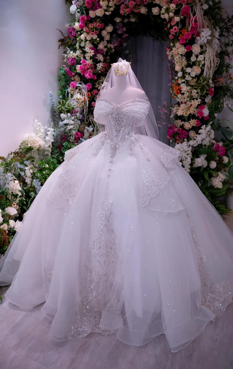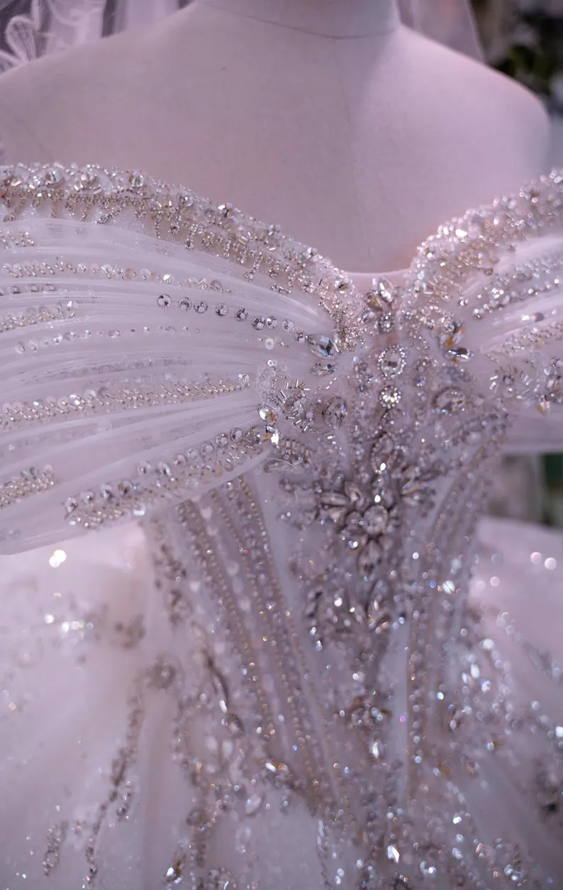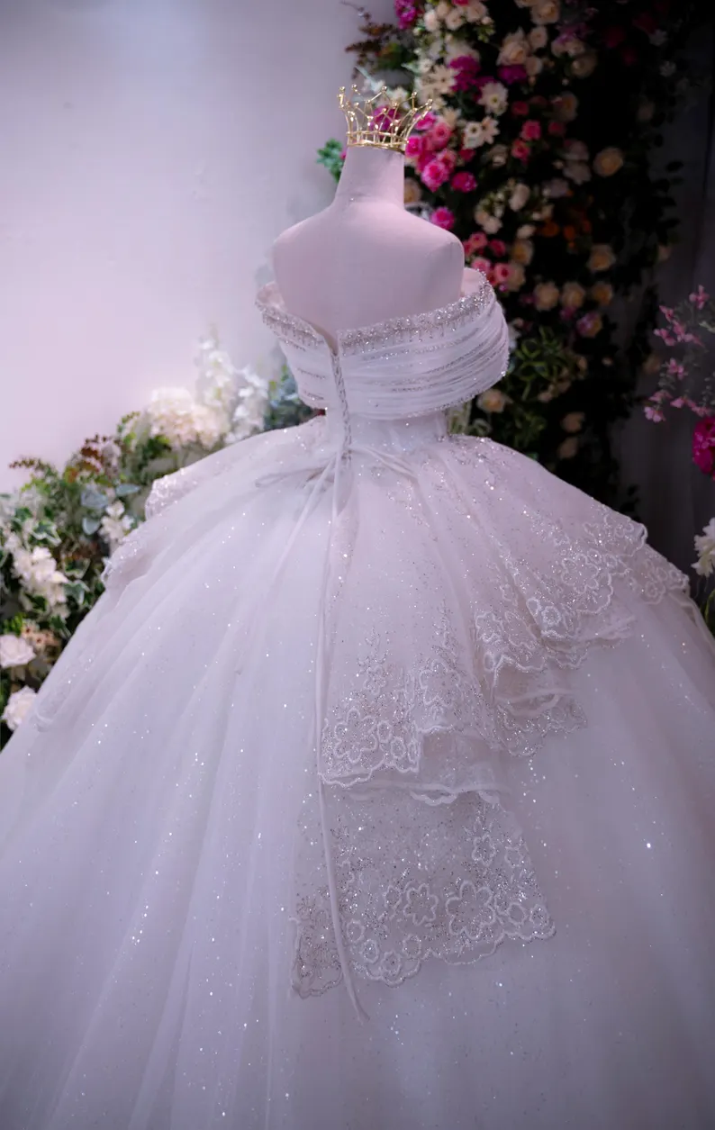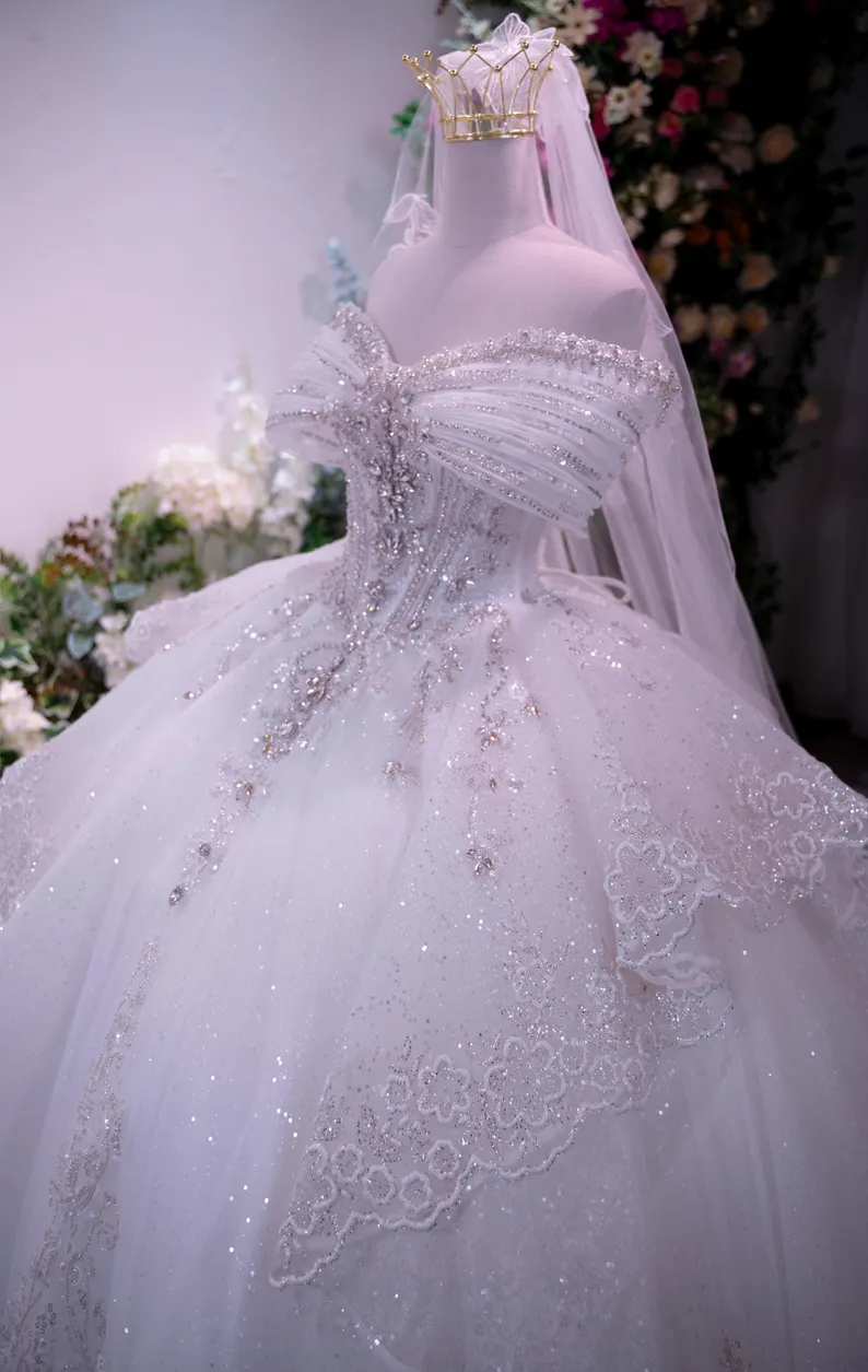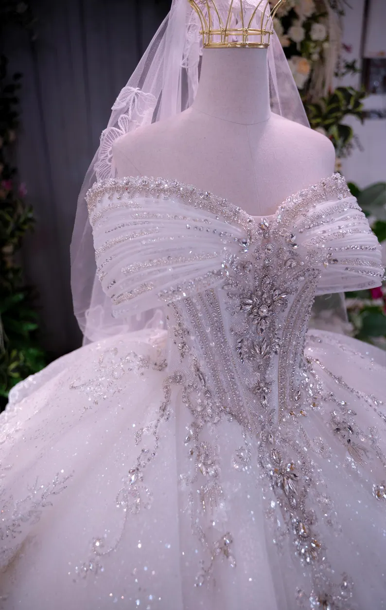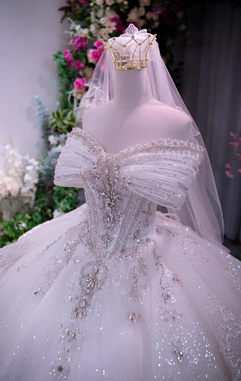 This stunning off-shoulder ball gown wedding dress is crafted for brides who envision a fairy-tale entrance. Adorned with shimmering crystal accents and intricate beadwork, the lavish glitter tulle skirt creates an awe-inspiring, royal appearance. The large bow feature at the waist and the sweeping cathedral train introduce an element of opulence, making it an ideal selection for a magnificent celebration.