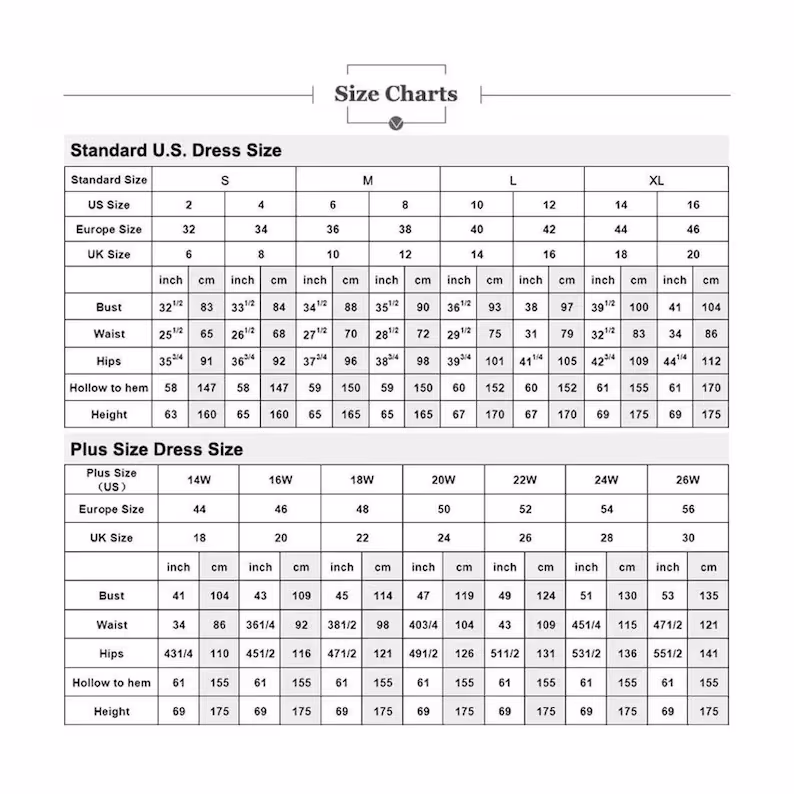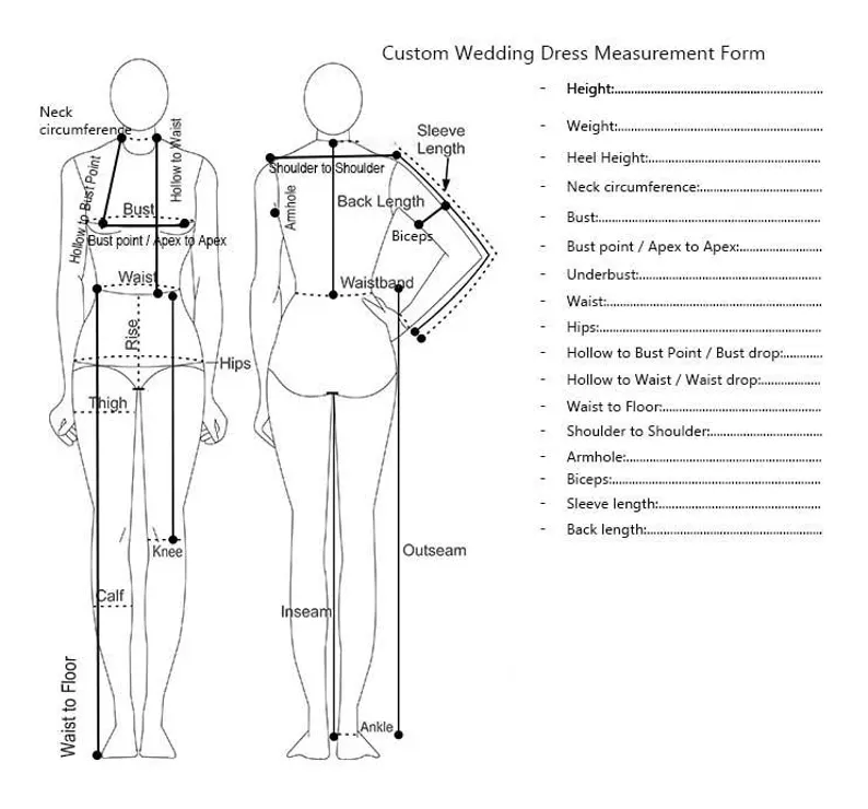 Measurements needed: Bust, waist, hips, hollow-to-floor, height, and heel height.