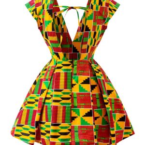 Featuring a short party dress with deep V neckline and short flare sleeve. This Beautifully and professionally crafted black African kente print dress is a must have for every fashionista, this outfit was carefully designed to fit in for all occasions so whether its casual or for a party, be sure to stand out from the crowd in this very gorgeous outfit.